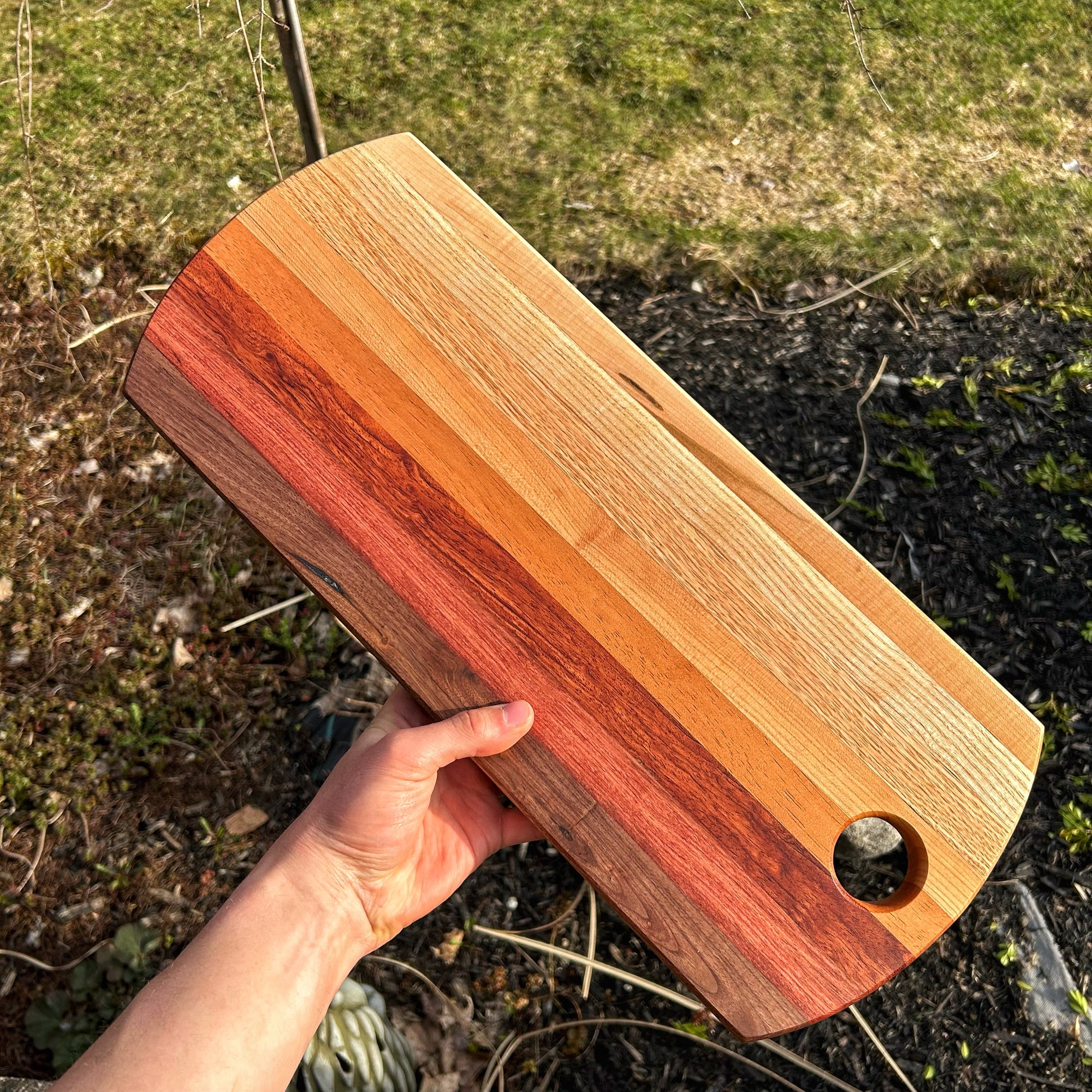 Details: Hardwood ombré serving board made from sustainably sourced hardwoods. Jaxwoodworx brand (seen via the photos) is lasered into bottom left-hand corner only on the boards show-face. (This product will also come with a 1oz tin of our made in house board conditioner).